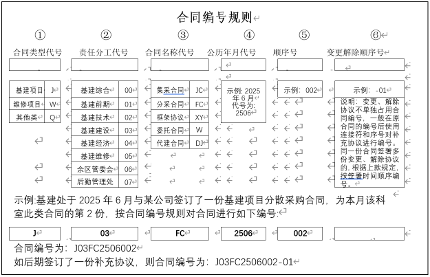 (三)框架协议(代号XY):通过集中采购确定合作的供应商或承包商,签订的年度维修服务协议,以及与设计、监理、造价咨询、检测等供应商签订的年度服务协议等。其特点是约定一定期限内多次交易的通用条款,具体项目需通过签订单次委托合同执行。框架协议需与单次执行的具体项目合同区分编号。